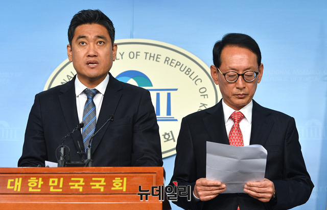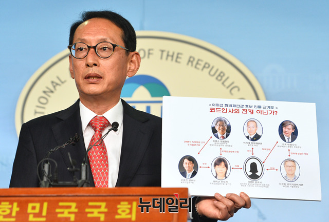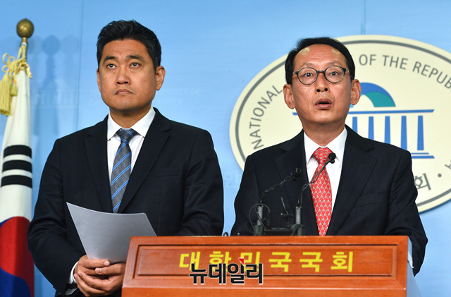 국회 법제사법위원회 김도읍 자유한국당 간사와 오신환 바른미래당 간사가 11일 오전 국회 정론관에서 이미선 헌법재판관 후보자의 자진사퇴를 촉구하는 기자회견을 갖고 있다.