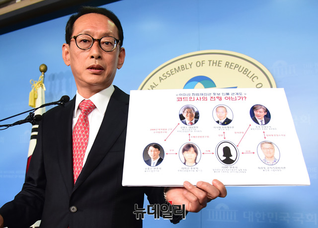 국회 법제사법위원회 김도읍 자유한국당 간사가 11일 오전 국회 정론관에서 이미선 헌법재판관 후보자의 자진사퇴를 촉구하는 기자회견에서 ''이미선 후보의 인물 관계도' 코드인사의 전형 아닌가?' 라고 적힌 피켓을 들고 발언을 하고 있다.