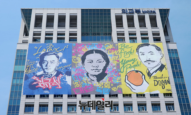 정부가 임시정부 수립 100년을 기념해 서울 종로구 정부서울청사와 외교부 청사에 내건 독립운동가 대형 초상화. 임시정부 초대 대통령 우남 이승만 초상이 빠져있다.