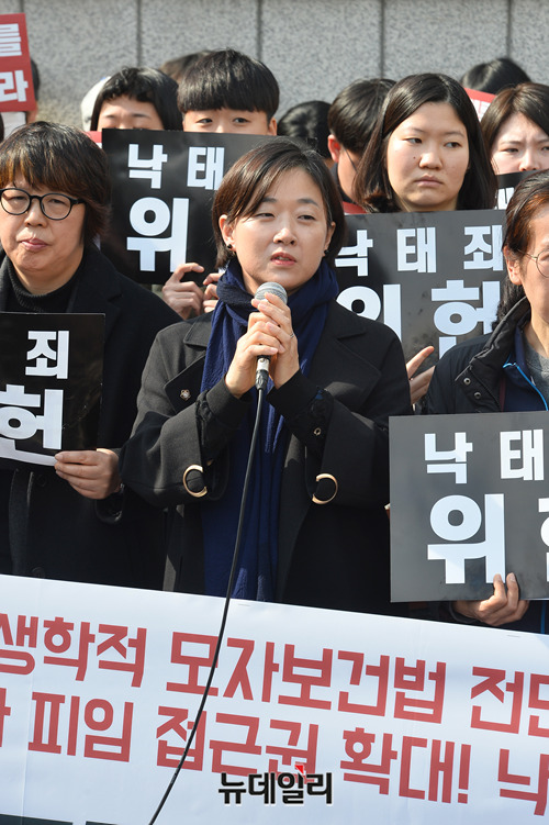 '낙태죄 위헌'을 주장하는 좌파단체 대리인단의 김수정 변호사가 11일 오후 서울 종로구 헌법재판소 앞에서 발언을 하고 있다. 헌법재판소는 이날 오후 "낙태한 여성을 처벌하도록 한 형법 조항이 헌법에 위배된다"고 결정했다.