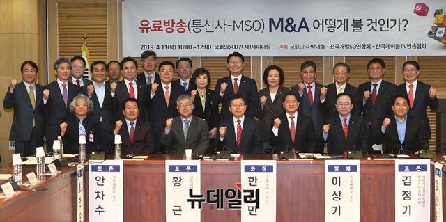 황교안 자유한국당 대표 및 정책토론회 참석자들이 11일 오전 국회 의원회관에서 열린 '유료방송 M&A 어떻게 볼 것인가?' 정책토론회에서 기념촬영을 하고 있다.