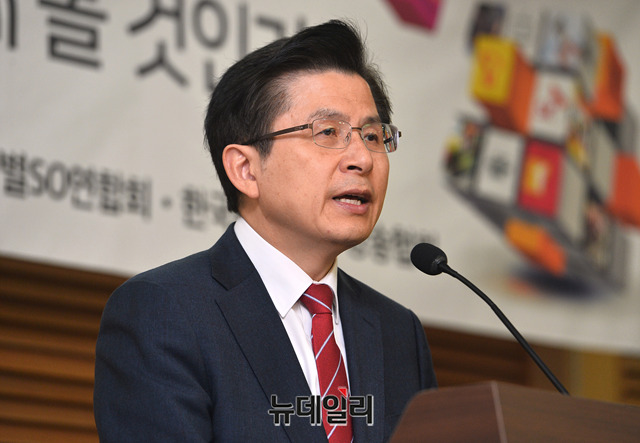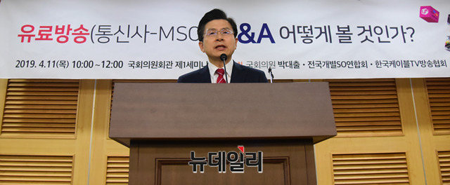 황교안 자유한국당 대표가 11일 오전 국회 의원회관에서 열린 '유료방송 M&A 어떻게 볼 것인가?' 정책토론회에 참석해 축사를 하고 있다.