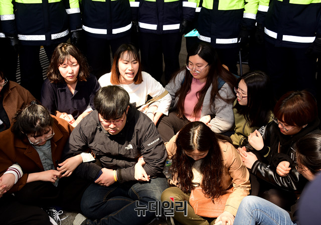 한국대학생진보연합 소속 대학생들이 12일 오전 국회 의원회관 입구에서 황교안 자유한국당 대표와 나경원 원내대표의 사퇴를 촉구하는 시위를 하고 있다.