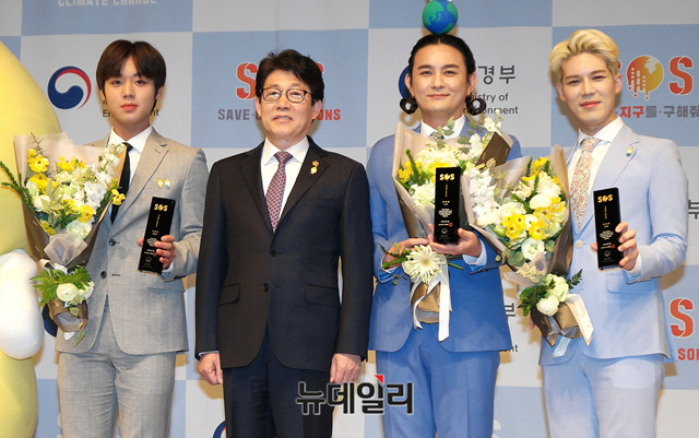가수 박지훈(왼쪽부터), 조명래 환경부 장관, 그룹 노라조 조빈, 원흠이 12일 오전 서울 중구 한국프레스센터에서 열린 환경부 '기후변화 홍보대사 위촉식'에 참석해 기념촬영을 하고 있다.