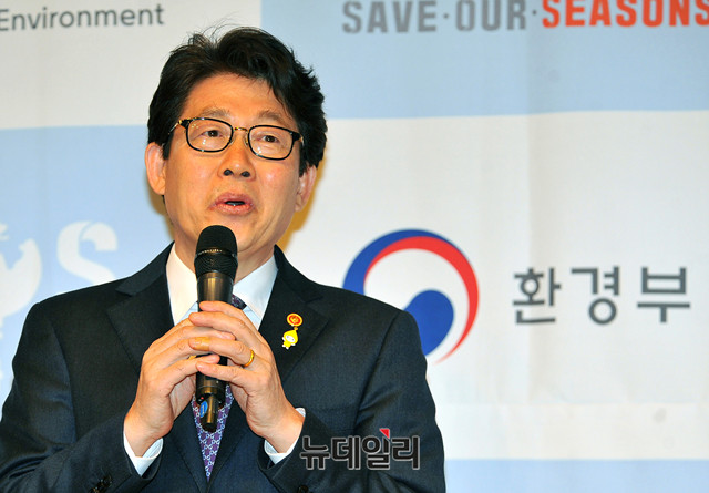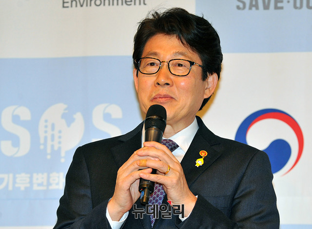 조명래 환경부 장관이 12일 오전 서울 중구 한국프레스센터에서 열린 환경부 '기후변화 홍보대사 위촉식'에 참석해 인사말을 하고 있다. 이날 환경부 기후변화 홍보대사로 가수 박지훈, 노라조가 위촉됐다. 이들은 환경부의 기후변화 대응 정책 홍보, 기후변화 공익활동 캠페인 등에 참여할 예정이다.