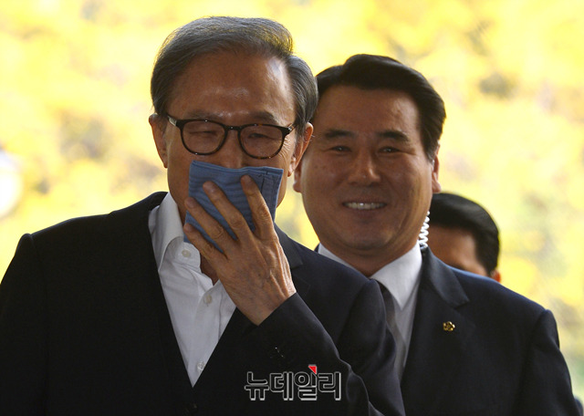 이명박 전 대통령이 12일 오후 서울 서초구 서울고등법원에서 열린 '다스 의혹' 관련 항소심 공판에 출석하고 있다. 이날 재판에는 김성우 전직 다스 대표와 권승호 전 전무, 남궁범 삼성전자 부사장이 증인으로 참석했다.