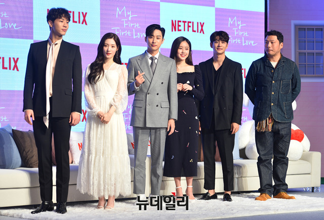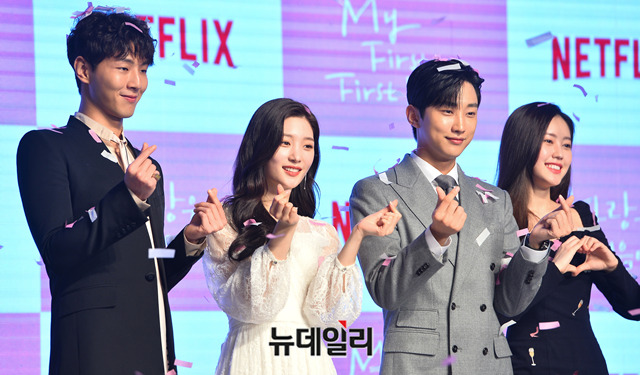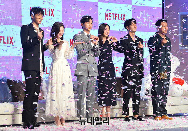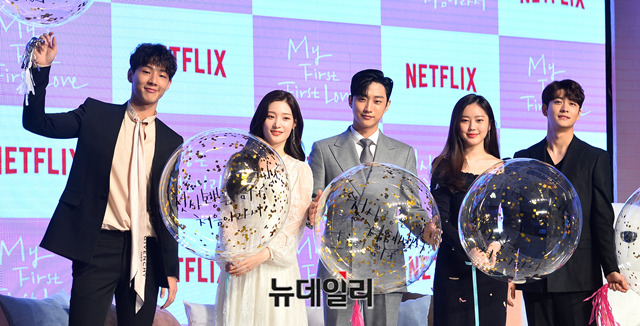 넷플릭스 오리지널 시리즈 '첫사랑은 처음이라서' 출연진이 12일 오전 서울 여의도 콘래드호텔에서 열린 제작발표회에 참석해 포토타임을 갖고 있다.