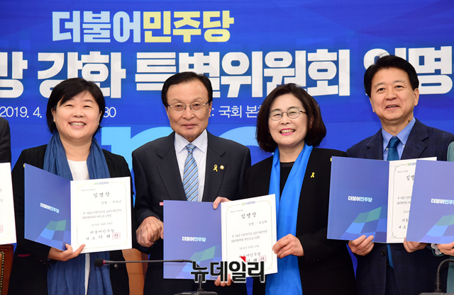 이해찬 더불어민주당 대표 및 위원들이 15일 오전 국회에서 열린 포용적사회안전망강화특별위원회 임명장 수여식에서 기념촬영을 하고 있다.