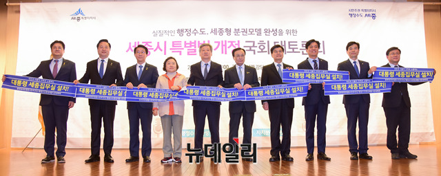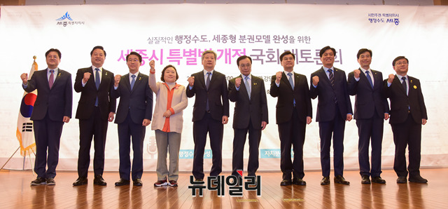 이해찬 더불어민주당 대표 및 참석자들이 15일 오후 국회 도서관에서 열린 '실질적인 행정수도, 세종형 분권모델 완성을 위한 세종시 특별법 개정 국회 대토론회'에서 기념촬영을 하고 있다.