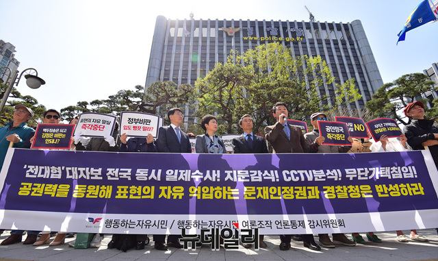 이인철 변호사가 15일 오후 서울 서대문구 경찰본청 앞에서 '전대협 대자보 강압수사'와 관련해 긴급 기자회견을 열고 항의성명을 발표하고 있다.이날 기자회견을 통해 행동하는자유시민은 "조선일보에 따르면 경찰이 무단 가택 침입 논란까지 빚으며 대자보 부착 관련자들에 대해 사실상 수사에 나선 것으로 확인 됐다"며 "여론조작 및 언론통제에 대한 文정권의 모든 시도에 대해 맞설 것"이라고 했다.또 항의 성명을 통해 △정치적 반대자 색출 수사 즉각 중단 △인적사항을 담은 블랙리스트 작성 즉각 사과하고 폐기 △수사를 지시한 윗선을 밝힐 것을 요구했다.
