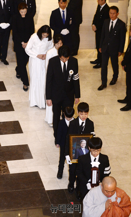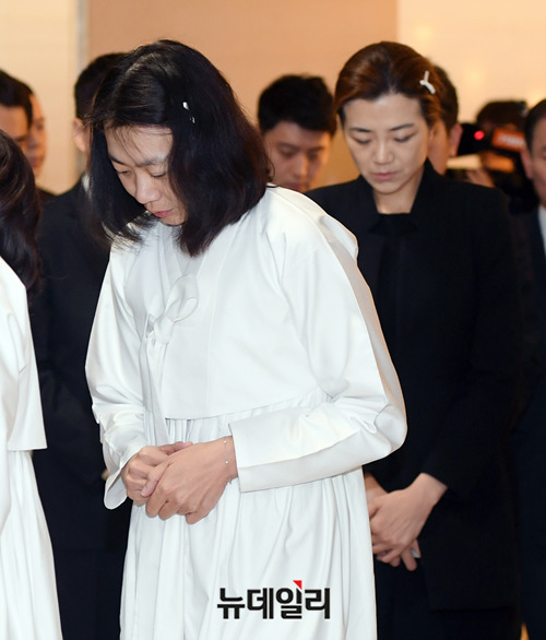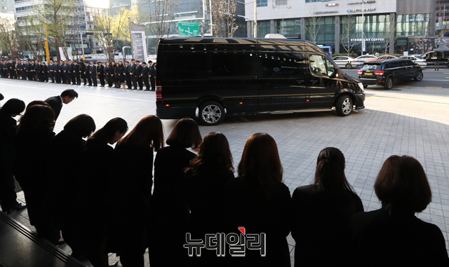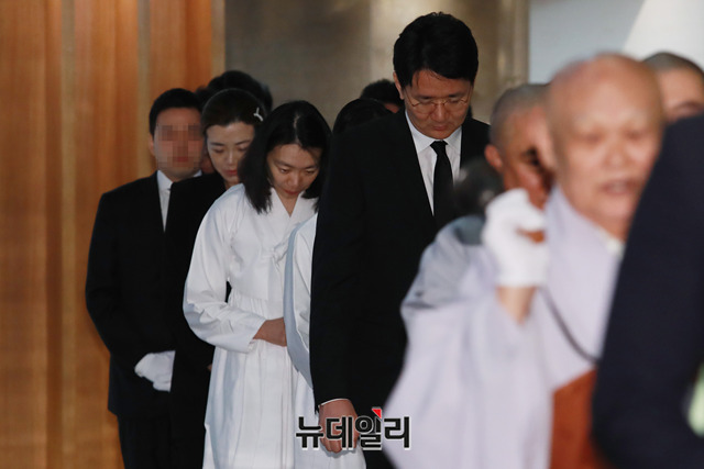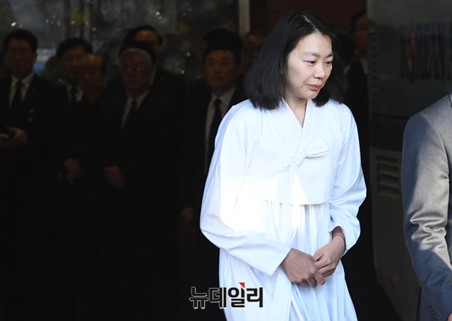 故 조양호 한진그룹 회장의 영결식이 16일 오전 서울 서대문구 세브란스병원 장례식장에서 진행된 가운데 故 조 회장의 장남인 조원태 대한항공 사장과 두 딸인 조현아 전 대한항공 부사장, 조현민 전 대한항공 전무가 슬픈 표정을 짓고 있다.