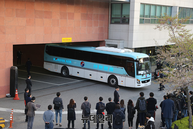故 조양호 한진그룹 회장의 운구차량이 16일 오전 서울 서대문구 세브란스병원 장례식장에서 영결식을 마친 직후 나서고 있다.
