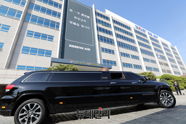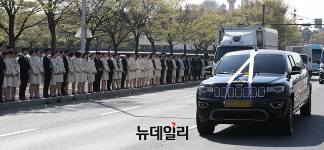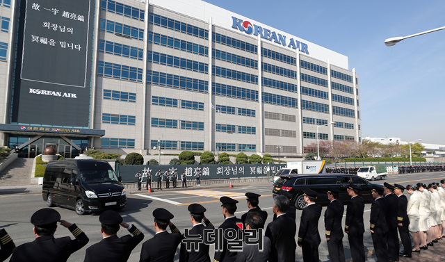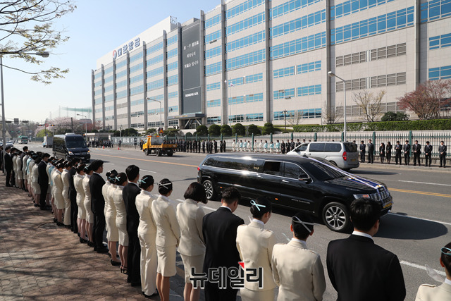 故 조양호 한진그룹 회장의 운구차량이 16일 오전 서울 강서구 대한항공 본사 앞을 지나가고 있다. 고인의 유해는 대한항공 본사에서 노제를 지내고 장지인 경기 용인시 하갈동 신갈 선영에 안장된다.