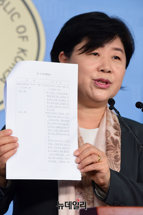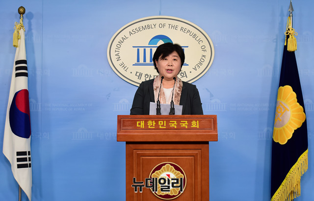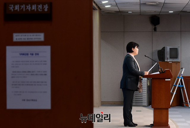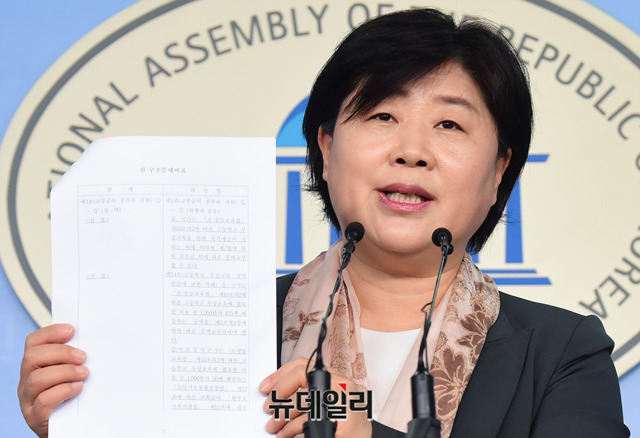 서영교 더불어민주당 의원이 16일 오전 국회 정론관에서 고교 무상교육 실시를 위한 재정확보 내용을 담은 '지방교육재정교부금법' 개정안과 관련해 발언하고 있다. 서 의원을 포함한 더불어민주당·민주평화당·정의당 소속 여야의원 57명이 해당 개정법률안 공동발의에 참여했다.