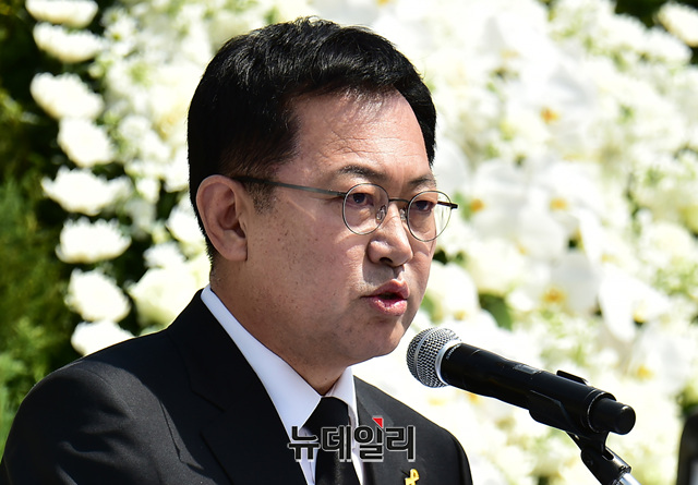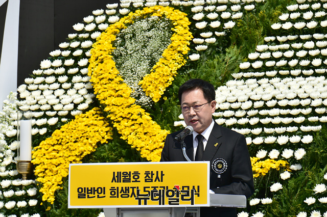 박남춘 인천시장이 16일 오전 인천 부평구 인천가족공원에서 열린 '세월호 참사 일반인 희생자 5주기 추모식'에서 추도사를 하고 있다.