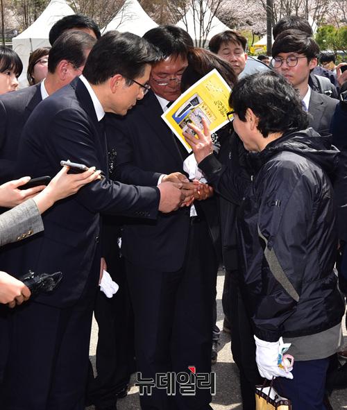 황교안 자유한국당 대표가 16일 오전 인천 부평구 인천가족공원에서 열린 '세월호 참사 일반인 희생자 5주기 추모식'에 참석해 유가족들과 인사를 나누고 있다.