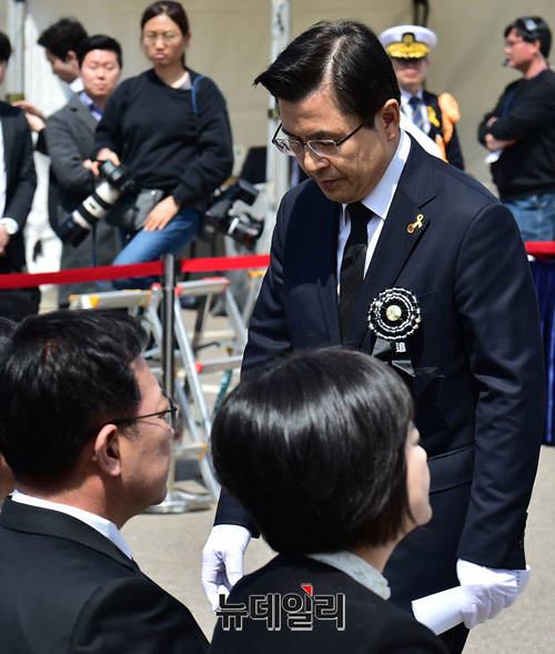 황교안 자유한국당 대표가 16일 오전 인천 부평구 인천가족공원에서 열린 '세월호 참사 일반인 희생자 5주기 추모식'에 참석해 추도사 마치고 자리로 향하고 있다.