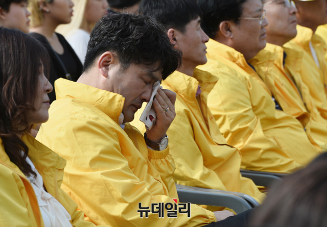 세월호 유가족들이 16일 오후 경기 안산시 단원구 화랑유원지에서 열린 '세월호 참사 5주기 추모식'에서 눈물을 보이고 있다. (경기 안산=박성원 기자)