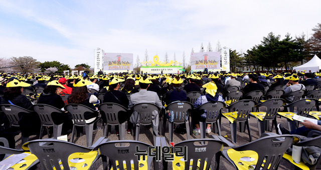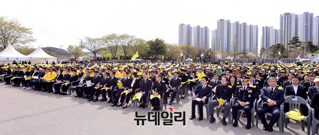 세월호 참사 5주기 추모식이 16일 오후 경기 안산시 단원구 화랑유원지에서 열리고 있다. 이날 행사에는 세월호 유족, 시민, 여야 당대표 및 유은혜 사회부총리 겸 교육부 장관, 문성혁 해양수산부 장관, 진선미 여성가족부 장관, 이재명 경기도지사, 이재정 경기도교육감 등 이 참석했다. (경기 안산=박성원 기자)