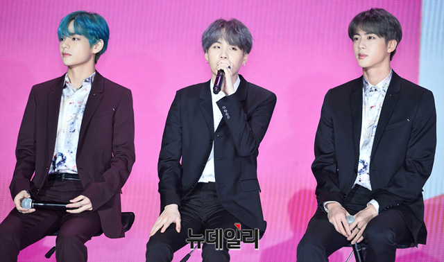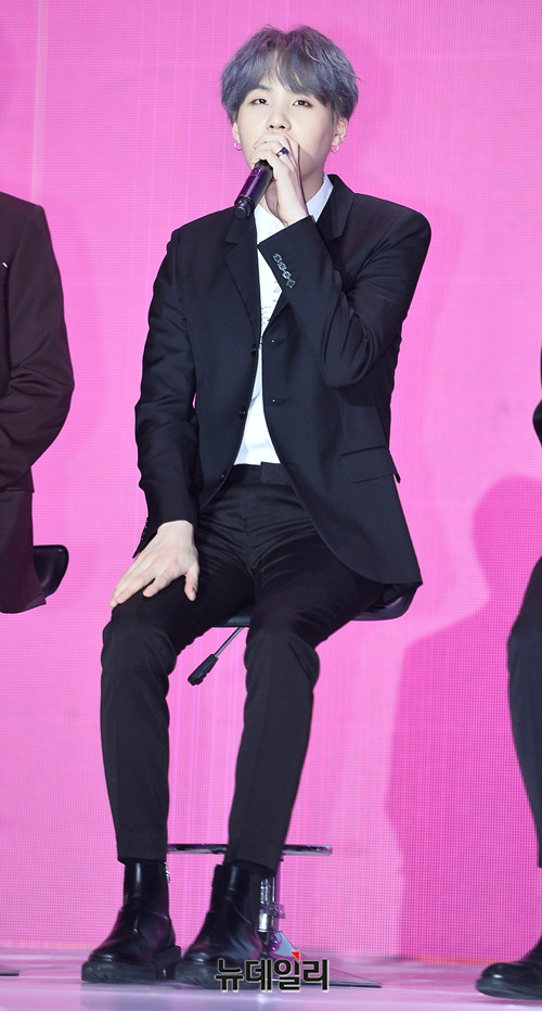 방탄소년단(BTS) 슈가가 17일 오전 서울 중구 동대문디자인플라자 알림관에서 열린 새 앨범 발매기념 기자간담회 'MAP OF THE SOUL : PERSONA(맵 오브 더 소울 : 페르소나)'에서 인터뷰를 하고 있다. '맵 오브 더 소울 : 페르소나'는 12일 발매 이후 전세계 음반차트에서 매일 기록을 경신하고 있다.
