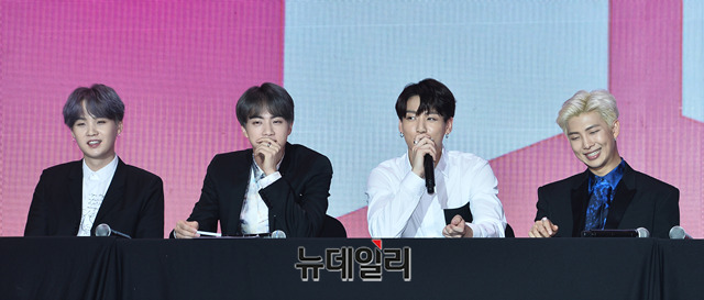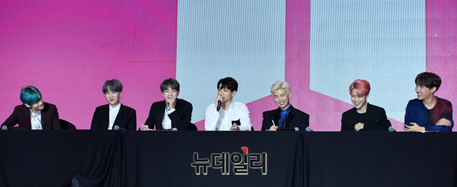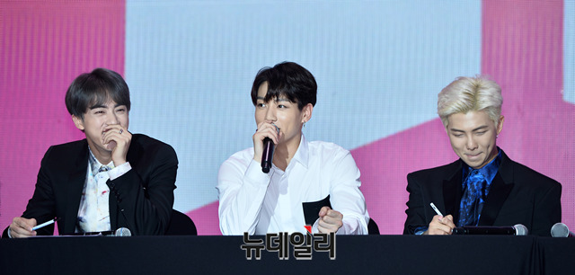 방탄소년단(BTS) 정국이 17일 오전 서울 중구 동대문디자인플라자 알림관에서 열린 새 앨범 발매기념 기자간담회 'MAP OF THE SOUL : PERSONA(맵 오브 더 소울 : 페르소나)'에서 취재진의 질문에 답하고 있다. '맵 오브 더 소울 : 페르소나'는 12일 발매 이후 전세계 음반차트에서 매일 기록을 경신하고 있다.