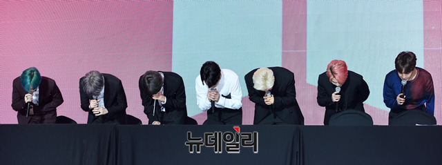 방탄소년단(BTS)이 17일 오전 서울 중구 동대문디자인플라자 알림관에서 열린 새 앨범 발매기념 기자간담회 'MAP OF THE SOUL : PERSONA(맵 오브 더 소울 : 페르소나)'에서 기자간담회를 마치고 마지막 인사를 하고 있다. '맵 오브 더 소울 : 페르소나'는 12일 발매 이후 전세계 음반차트에서 매일 기록을 경신하고 있다.