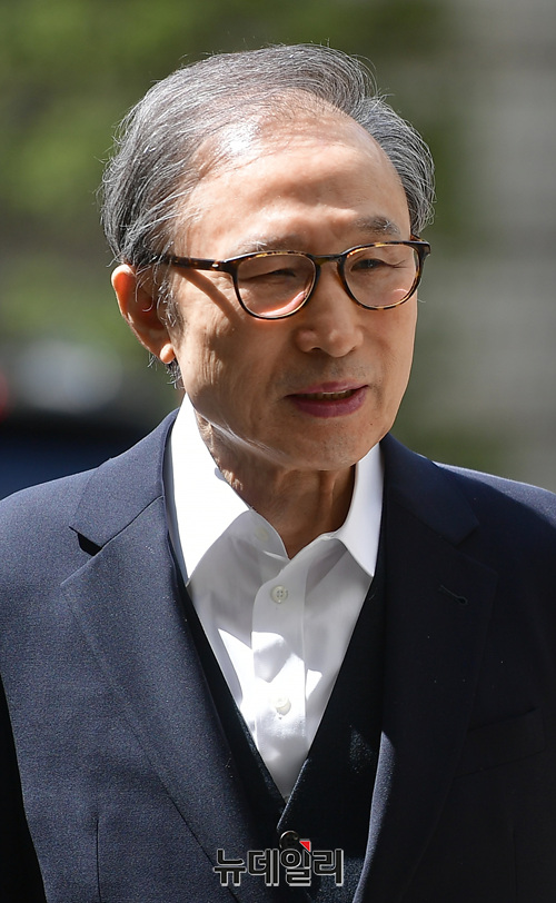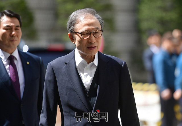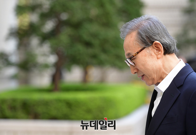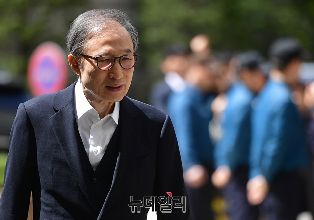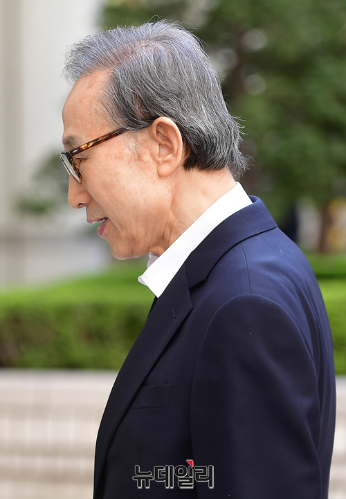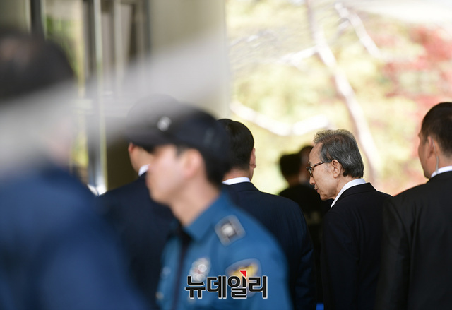 이명박 전 대통령이 17일 오후 서울 서초구 서울고등법원에서 열린 재판에 참석하기 위해 법정으로 이동하고 있다. 재판에 증인으로 참석 예정이던 이상주 변호사는 불출석 했다.