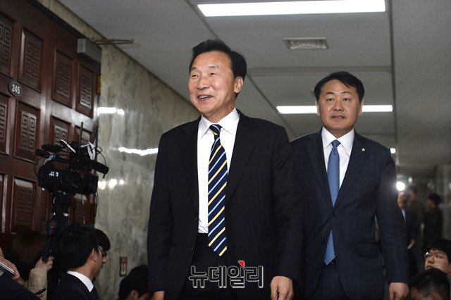 손학규 바른미래당 대표와 김관영 원내대표가 18일 오전 국회에서 비공개로 열리는 제54차 의원총회에 입장하고 있다.