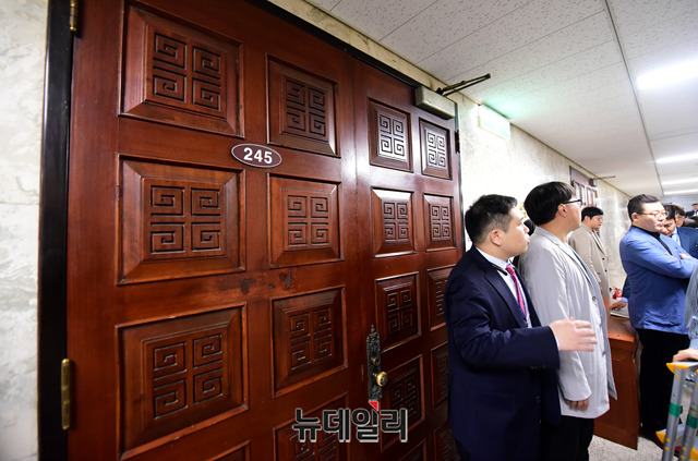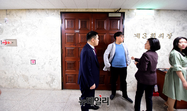 바른미래당 당직자들이 18일 오전 국회에서 열린 바른미래당 비공개 의원총회장 입구를 통제하고 있다.