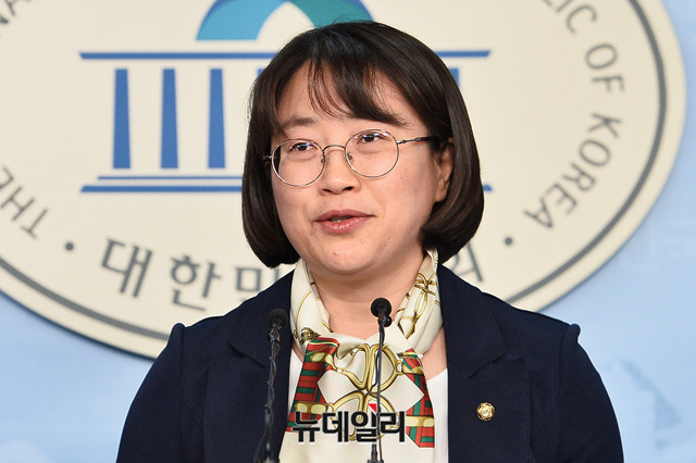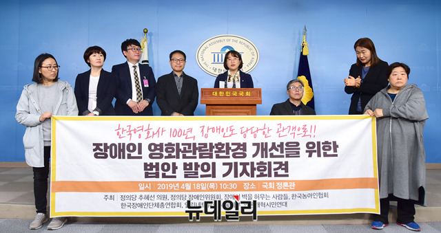 추혜선 정의당 의원이 18일 오전 국회 정론관에서 장애인 영화관람권 확보를 위한 법안 발의와 관련해 기자회견을 갖고 있다.
