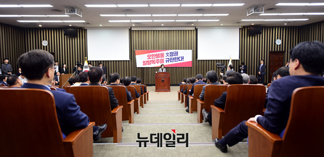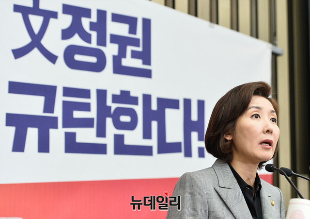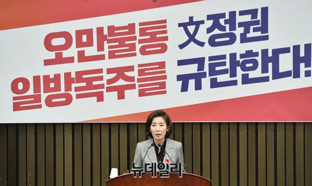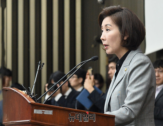 나경원 자유한국당 원내대표가 18일 오후 국회에서 열린 긴급의원총회에서 모두발언을 하고 있다.