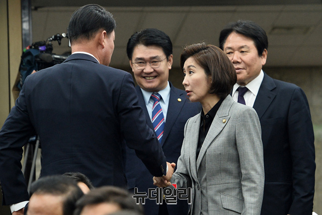 나경원 자유한국당 원내대표가 18일 오후 국회에서 열린 긴급 의원총회에 참석하며 동료의원들과 악수를 나누고 있다.