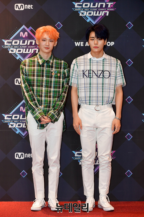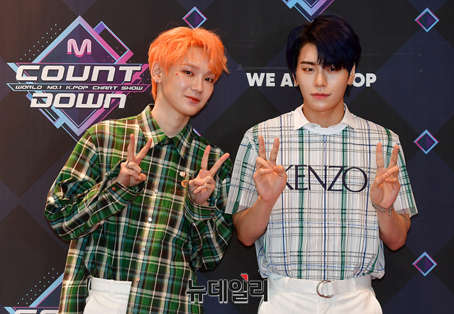 JBJ95 켄타(왼쪽)와 상균이 18일 오후 서울 마포구 CJ E&M에서 열린 엠카운트다운 생방송에 앞서 포토타임을 갖고 있다. 이날 엠카운트다운에는 모모랜드, 스트레이키즈, 원더나인, 에버글로우, 김성리 등의 가수가 출연한다.