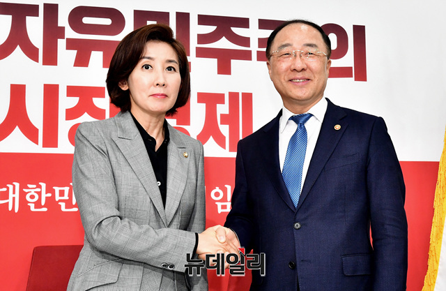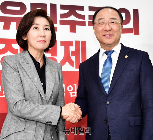 나경원 자유한국당 원내대표가 18일 국회에서 홍남기 경제부총리 겸 기획재정부 장관의 예방을 받고 악수를 나누고 있다.