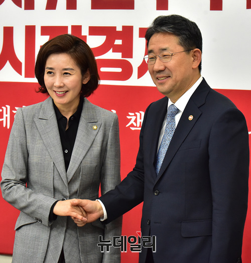 나경원 자유한국당 원내대표가 18일 국회에서 박양우 신임 문화체육관광부 장관 예방을 받고 악수를 나누고 있다.