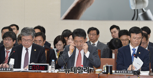 박양우 문화체육관광부 장관이 19일 오전 국회에서 열린 4차 산업혁명 특별위원회에서 안경을 고쳐쓰고 있다.