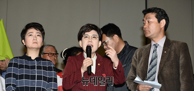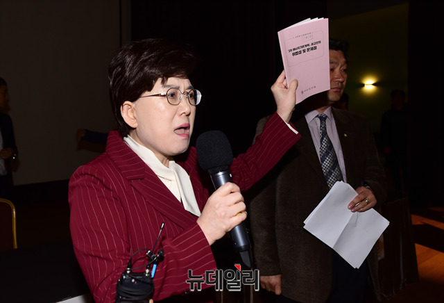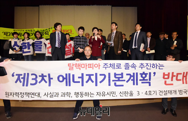 최연혜 자유한국당 의원이 19일 오후 서울 강남구 코엑스 컨퍼런스룸에서 열린 '제3차 에너지기본계획 반대 합동 기자회견'에서 모두발언을 하고 있다. 최 의원은 "문재인 정부의 일방통행식 정책을 막아야 한다"고 주장했다.