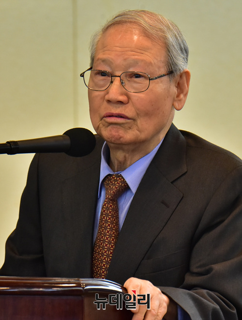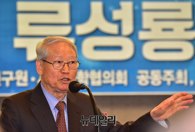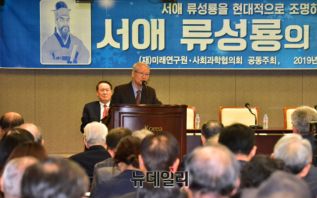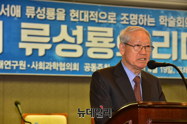 송복 전 연세대학교 사회학과 교수가 19일 오후 서울 중구 프레스센터에서 열린 '서애 류성룡의 리더십' 학술회의에서 '류성룡의 사관:미래지향성 리더십'을 주제로 기조논문 발표를 하고 있다. 이날 행사는 미래인력연구원이 주최하고 서애선생기념사업회가 후원하며 서애 리더십 평가 분석서의 출판기념회를 겸해서 열렸다.