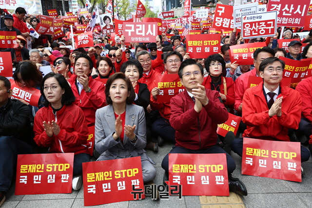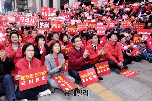황교안 자유한국당 대표, 나경원 원내대표 등 자유한국당 의원들이 20일 오후 서울 종로구 세종문화회관 앞에서 열린 '문재인 STOP! 국민이 심판합니다!' 규탄대회에 참석해 자리하고 있다.