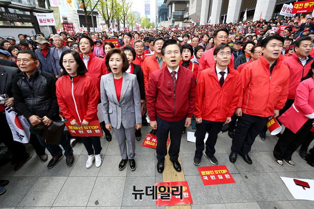 [포토] 시민들과 애국가 제창하는 자유한국당