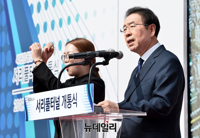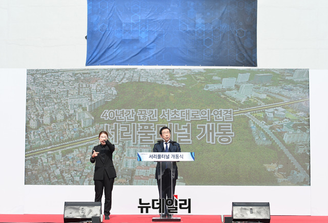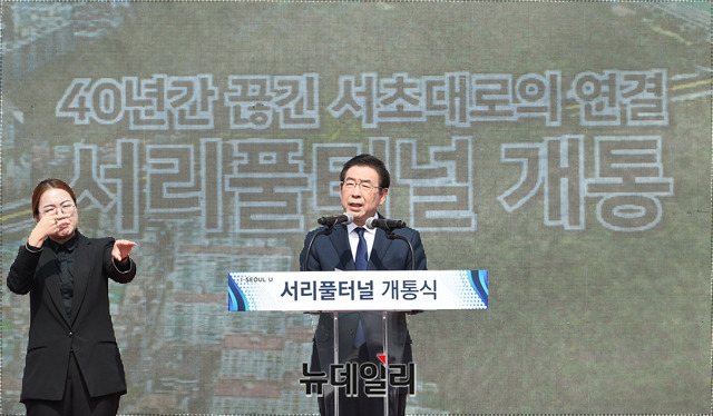 박원순 서울시장이 21일 오후 서울 서초구 서리풀터널 앞에서 열린 '40년간 끊긴 서초대로의 연결, 서리풀터널 개통식'에서 인사말을 하고 있다.