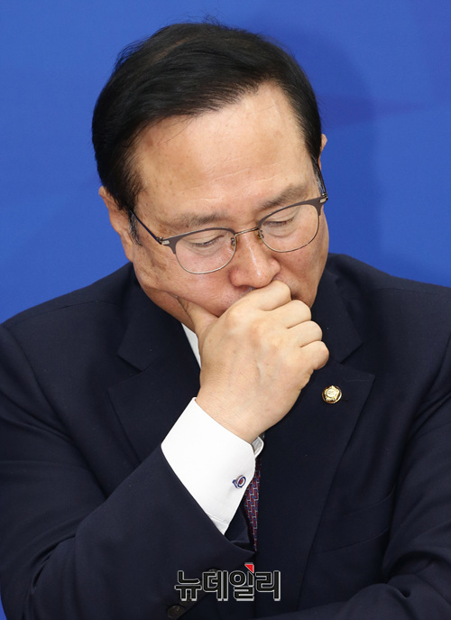 홍영표 더불어민주당 원내대표가 22일 오천 국회 당회의실에서 열린 최고위원회의에 참석해 얼굴을 만지고 있다.