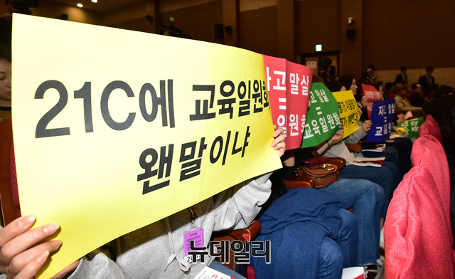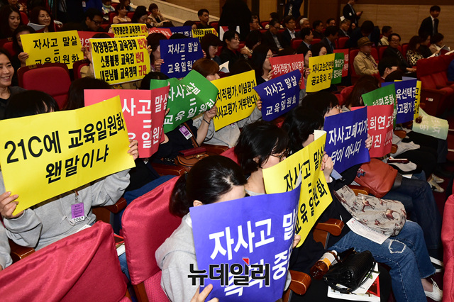 '헌재 판결후 되짚어 보는 문재인 정부 자사고 정책 토론회'가 22일 오전 국회 의원회관서 열린 가운데 참석자들이 하향평준화 교육정책 반대 등이 적힌 피켓을 들고 있다.