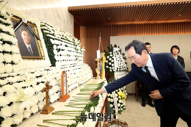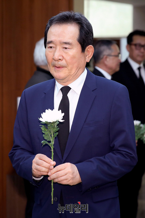 정세균 전 국회의장이 22일 오후 서울 서대문구 신촌세브란스병원 장례식장에 마련된 故 김홍일 전 민주당 의원의 빈소를 찾아 조문하고 있다.
