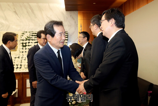 정세균 전 국회의장이 22일 오후 서울 서대문구 신촌세브란스병원 장례식장에 마련된 故 김홍일 전 민주당 의원의 빈소를 찾아 조문한 뒤 유가족을 위로하고 있다.