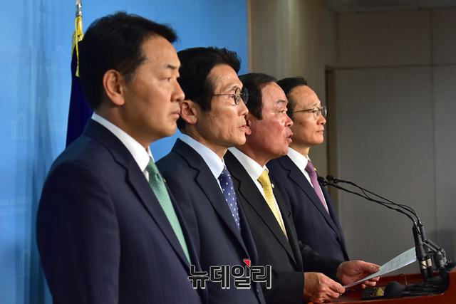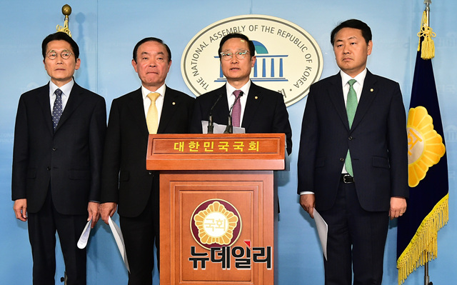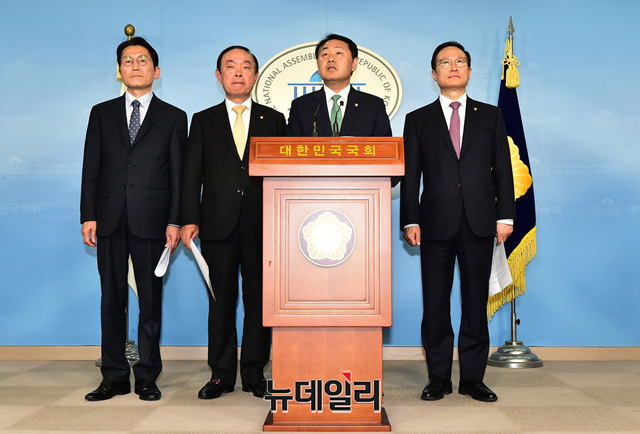 여야 4당(홍영표 더불어민주당, 김관영 바른미래당, 장병완 민주평화당, 윤소하 정의당)원내대표들이 22일 오후 국회 정론관에서 선거제 개혁법안과 고위공직자비리수사처법 패스트트랙 처리에 대해 잠정합의 발표를 하고 있다.