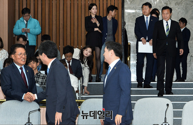 손학규 바른미래당 대표와 김관영 원내대표가 23일 오전 국회에서 열린 바른미래당 제55차 의원총회에 입장하고 있다.