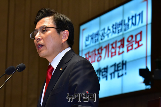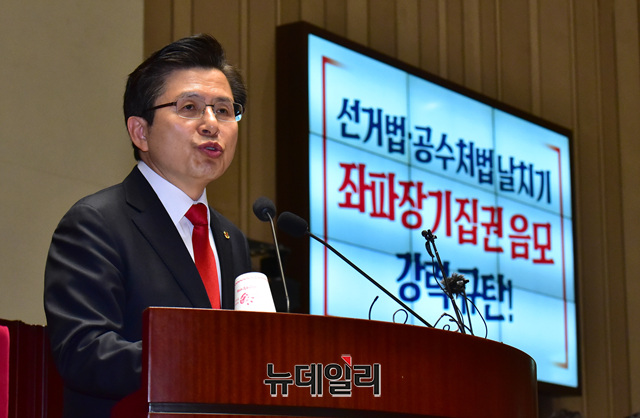 황교안 자유한국당 대표가 23일 오전 국회에서 열린 긴급의원총회에서 모두발언을 하고 있다. 이날 의원총회는 선거제 개편안, 공수처 설치법 등의 패스트트랙 여야4당 합의 사항을 규탄하기 위해 열렸다.