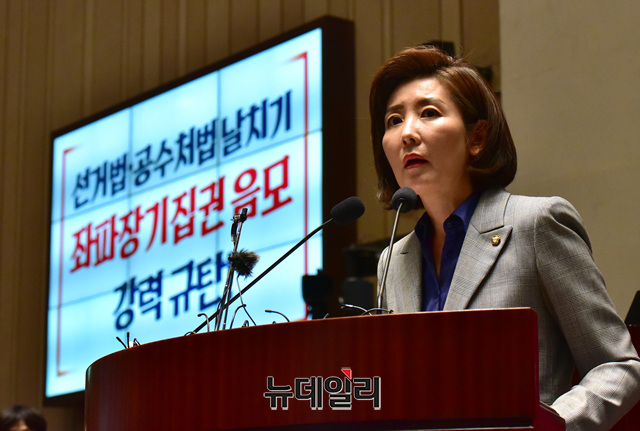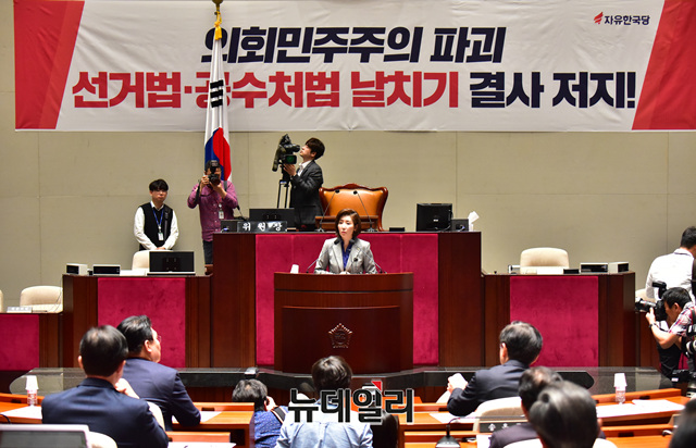 나경원 자유한국당 원내대표가 23일 오전 국회에서 열린 긴급의원총회에서 모두발언을 하고 있다. 이날 의원총회는 선거제 개편안, 공수처 설치법 등의 패스트트랙 여야4당 합의 사항을 규탄하기 위해 열렸다.