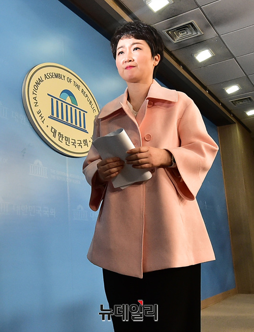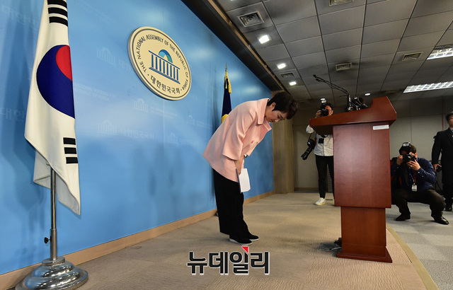 이언주 바른미래당 의원이 23일 오후 국회 정론관에서 패스트트랙 합의안 추인에 반발해 탈당을 선언을 한 후 회견장을 떠나고 있다.